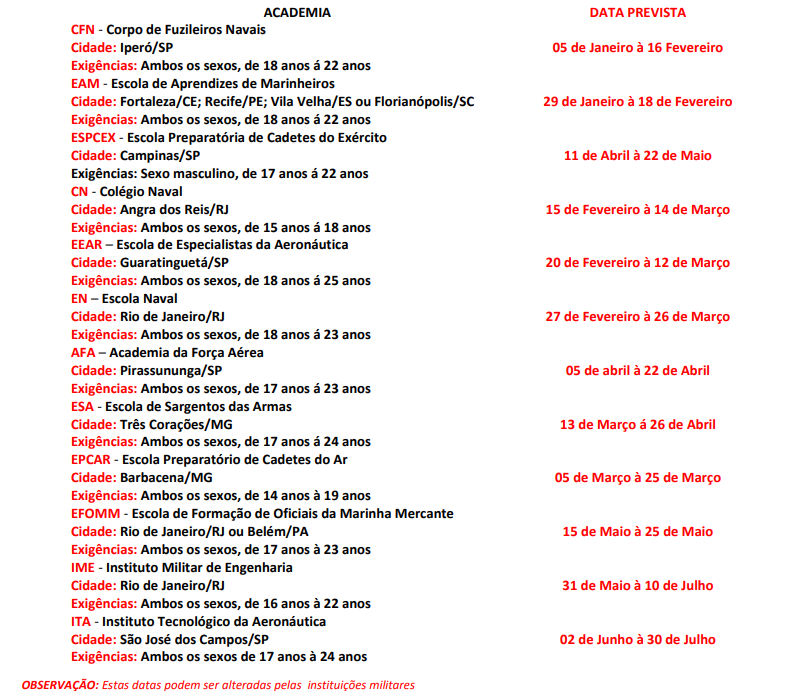 Aeronáutica: Escola Preparatória de Cadetes do Ar (EPCAR);